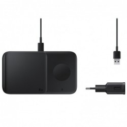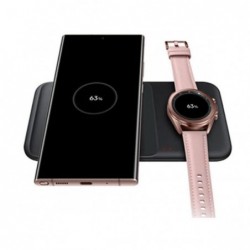 Samsung Wireless Charger Duo 25W EP-P4300. Carregador sense fil que permet carregador dos dispositius alhora. Compatible amb smartphone galaxy, galaxy watch, buds, iphone i airpods. Aconsegueix l'energia que necessites ràpidament gràcies al sistema de càrrega ràpida fins a 9W. Aquest sistema és compatible amb USB PD i amb els adaptadors de viatge per a càrrega ràpida. Dos llums led no només indiquen l'estat de la càrrega sinó que també es poden ajustar per baixar la brillantor.