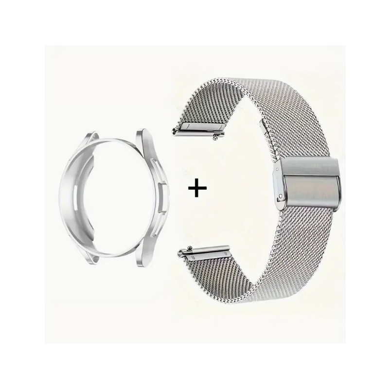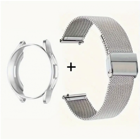 Corretja amb carcassa per a Samsung Galaxy Watch 6 de 40mm. Corretja de color platejat d'acer inoxidable amb carcassa de silicona que s'adapta perfectament al Watch 6 de 40mm i el protegeix de cops i ratllades.