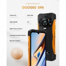 Telèfon rugeritzat Doogee S98. Equip octa-core impulsat per l'eficient processador Helio G96 amb 8 GB de RAM i 256 GB d'emmagatzematge intern ampliables mitjançant targeta de memòria. Té una gran bateria de 6000 mAh amb càrrega ràpida de 33W i també admet la càrrega sense fil. Està equipat amb NFC. Compte amb una càmera triple amb un sensor principal de 64MP, un de 20MP amb visió nocturna i un gran angular de 8MP. La càmera frontal és de 16MP. Equipat amb una pantalla de 6,3" corning gorilla glass. Les seves dures credencials inclouen les certificacions MIL-SPEC 810G, IP68 i IP69K que el fan resistent a cops, pols i aigua.