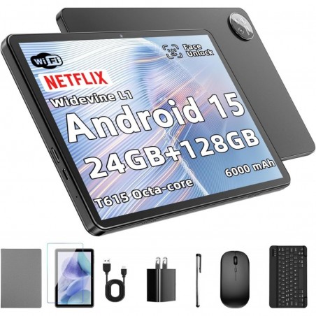 Tablet Widevine L1 amb wi-fi 5G que inclou teclat bluetooth, ratolí, pen i protector per a la pantalla. Equip amb Android 15. Amb una pantalla LCD de 10.1" IPS FHD amb una resolució de 1280 x 800. Té un processador de vuit nuclis Unisoc T615 amb 24GB de RAM (8+16) i 128GB de memòria interna ampliable mitjançant targeta de memòria de fins a 1TB. Gran bateria de 6000mAh. Càmera trasera de 8Mpx i frontal de 5Mpx. Desbloqueig facial.