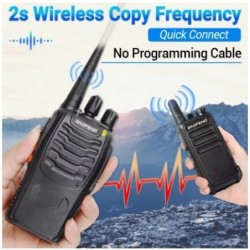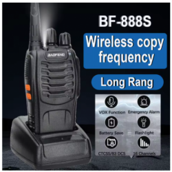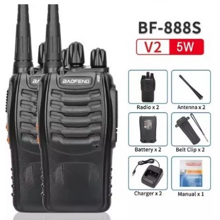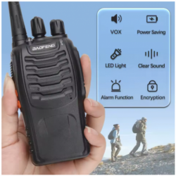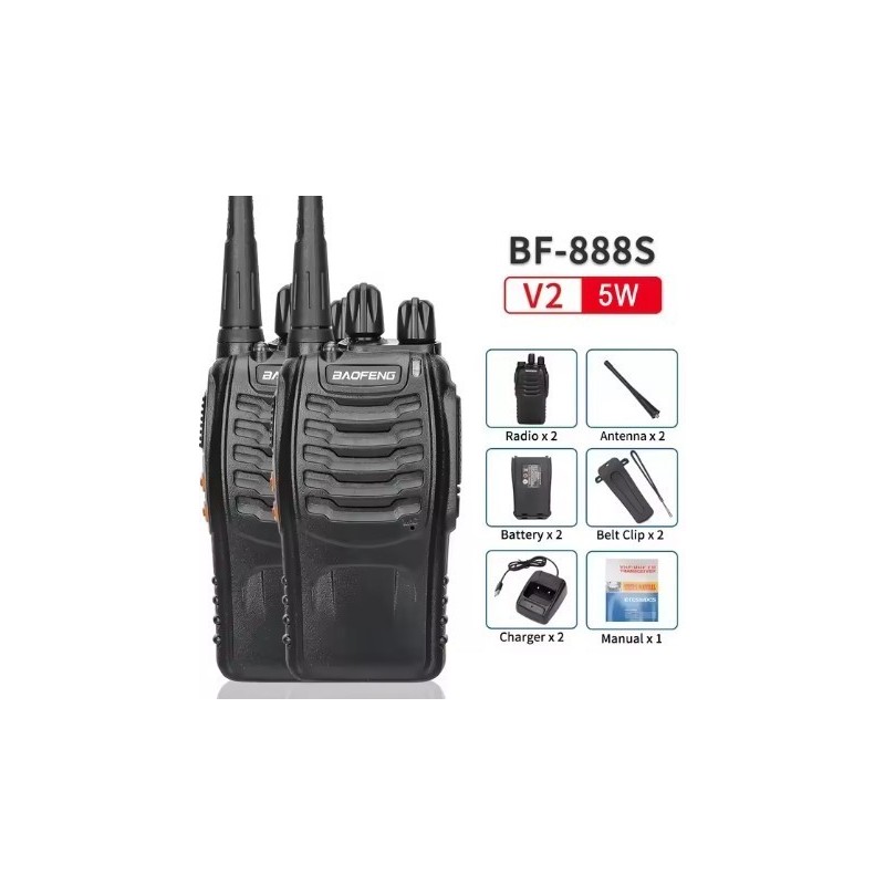 Pareja de walkie talkies BF-888s. Con un diseño compacto y resistente ideal para usuarios que necesitan un dispositivo ligero y resistente. Es perfecto para aplicaciones profesionales como eventos, seguridad o logística, así como para usuarios recreativos que buscan una solución asequible y eficiente. Tiene una potencia de salida de 5W y un alcande de hasta 5 Km. Su batería de 1.500mAh permite su uso continuo sin necesidad de recarga frecuente. Incluyen base de carga, antena y pinza.