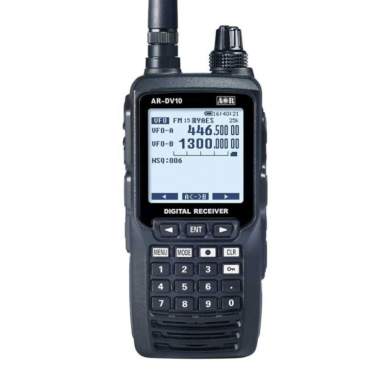 El AOR AR-DV10 SDR es un receptor analógico y digital portátil de banda ancha (100 KHz 1300 MHz). Decodifica la mayoría de modos digitales como: MOTOTRBO DMR , dPMR , APCO P25, NXDN , Icom D-Star , CR Digital, Yaesu, Kenwood® y Alinco EJ-47U y las señales analógicas AM, FM ancha, FM estrecha, banda lateral superior e inferior LSB y USB, CW, Es uno de los receptores portátiles más completos del mercado, gracias a su modo automático digital el receptor es capaz de reconocer las señales analógicas o digitales y automáticamente cambiar al modo adecuado. También podemos elegir los modos manualmente. Dispone además de sistema de control de ganancia automático (AGC).
