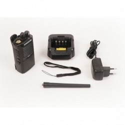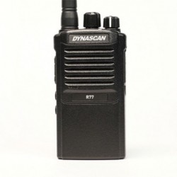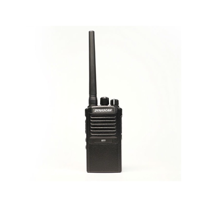 Walkie Talkie PMR446 sin licencia compacto y robusto. Programable y personalizable a través de PC: Software sencillo. 8 canales, subtonos CTCSS y códigos DCS programables. Temporizador de transmisión TOT y escaneado prioritario. Función VOX. Gran autonomía: Batería 1600 mAh y función ahorro de batería. Toma auricular de tipo Kenwood. Éste Walkie Talkie de uso libre es ideal para entornos hostiles y zonas industriales, ya que está especialmente diseñado con un cuerpo muy robusto y sin pantalla, para evitar posibles roturas. Pero esto no supone ningún límite ya que el Dynascan R-77 es totalmente programable y sus funciones pueden seleccionarse a través del PC.