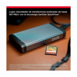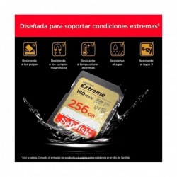 Tarjeta de memoria SanDisk Extreme de 256 GB de capacidad, clase 10, velocidad UHS de clase 3, hasta 180 MB/s en lectura y 60 MB/s en escritura, ideal para grabación de vídeo en 4K, resistente a las temperaturas extremas, al agua, a golpes y a rayos X.
