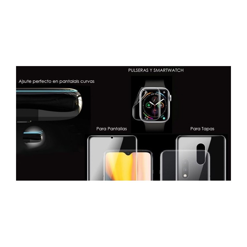 Válido para todos las marcas y modelos. AL REALIZAR EL PEDIDO INDIQUE SU MODELO DE TELÉFONO EN OBSERVACIONES. El protector de hidrogel de 0,4mm practicamente invisible se realiza a medida para cualquier tipo de móvil, reloj, fit band y cámara. Película nanotecnológica de moléculas de Hidrógeno que se autorepara en 24 horas. Ajuste perfecto para pantallas curvas y redondeadas. Anti-caída, a prueba de golpes i repele cualquier líquido. Definición HD de la pantalla, no pierde calidad de imagen. La lamina una vez pegada no se despega. Con possibilidad de realizar la parte trasera del teléfono, añada 2 unidades al carrito e indique el modelo del teléfono que desea el protector en la sección añadir comentario cuando elija el metodo de envío.