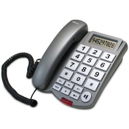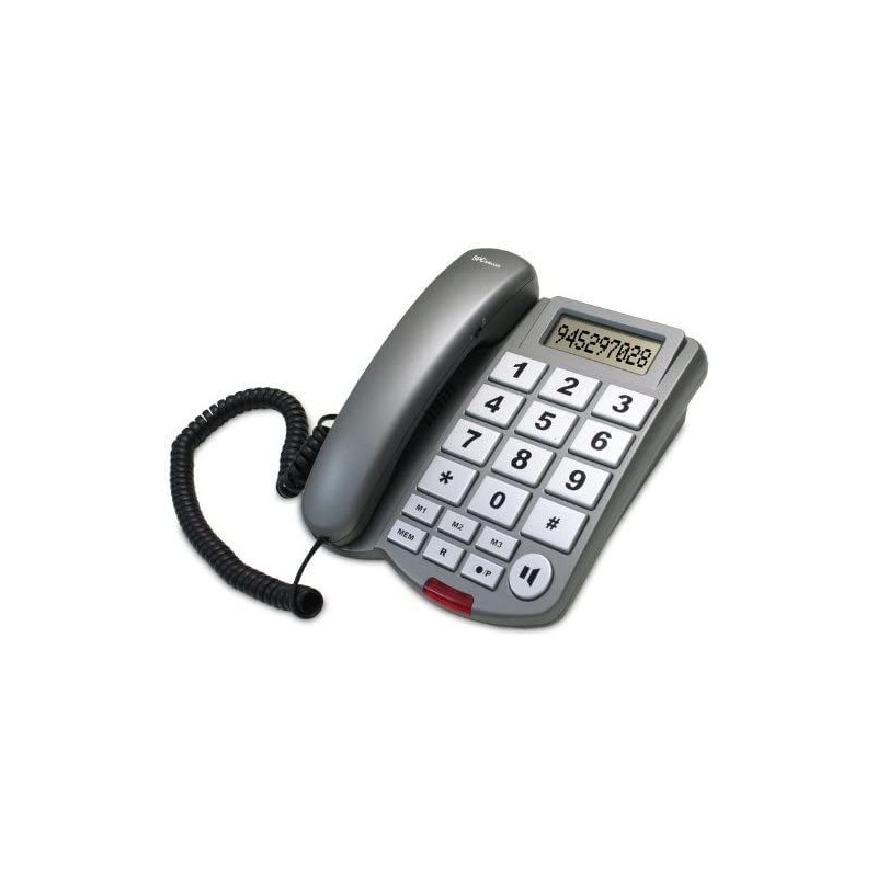 Teléfono y pantalla con teclas y números grandes. Posibilidad de amplificación alternativa con audífono en posición T. El teléfono cuenta con 3 memorias de marcación rápida y luz de timbre.