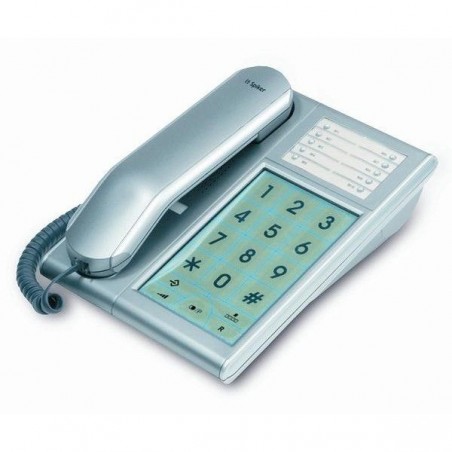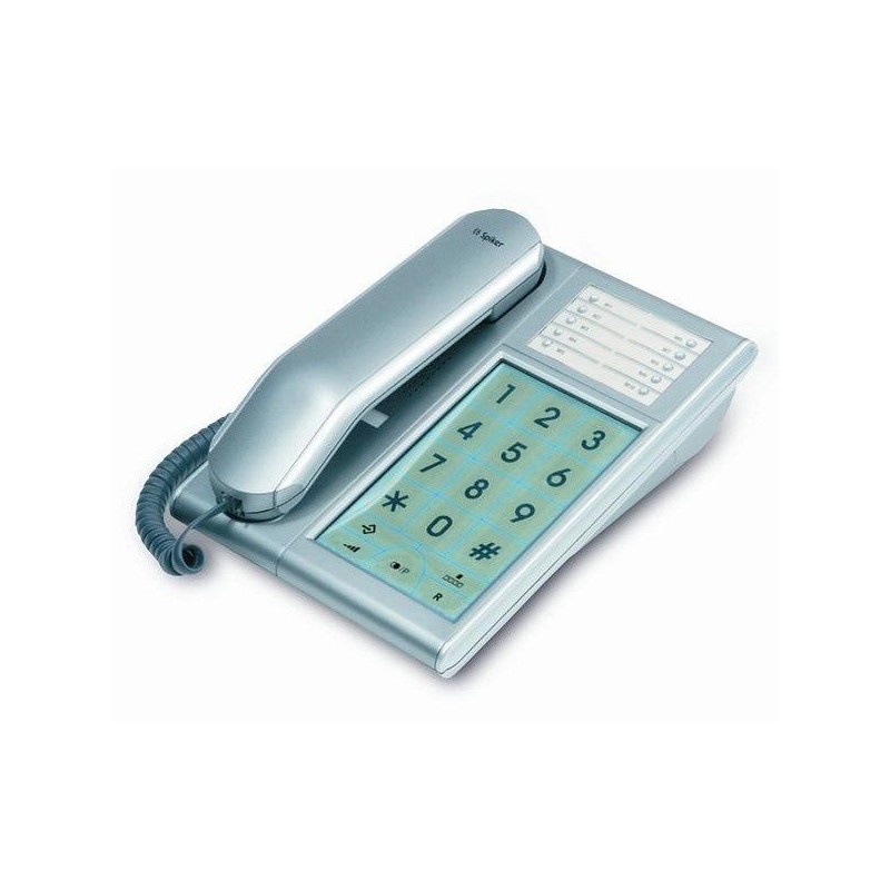 Teléfono con teclado táctil extra-grande. Cuenta con 10 memoria directas, 10 indirectas, volumen de timbre y auricular regulable y prefijo para pre-marcación. Montaje sobremesa o mural.