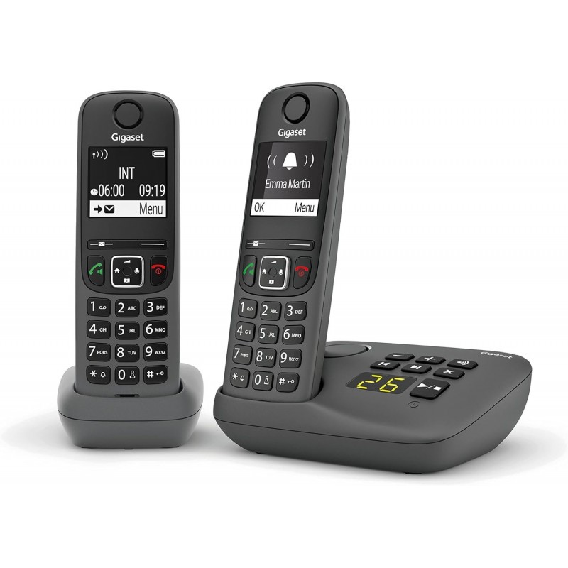 Inalambrico Gigaset AS690a Duo con contestador automático con capacidad de grabación de hasta 20 minutos. Pantalla ultra legible: pantalla blanca retroiluminada de 2" y teclado retroiluminado. Agenda con 100 contactos. Modo manos libres con sonido de alto rendimiento (HSP). Identificación de llamadas. Bloqueo de llamadas. Autonomía en la comunicación: 18 horas.