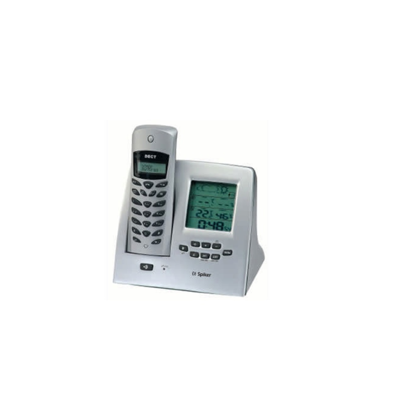 Teléfono inalámbrico Dect. Tiene una pantalla LCD, manos libres, identificación de llamadas, lista de las últimas 30 llamadas recibidas, agenda de 10 entradas, rellamada a los últimos 5 números, control de volumen del timbre, función "mute", previsión del tiempo y medición de la presión atmosférica, lectura de la temperatura y la humedad externa e interna y función alarma/despertador.