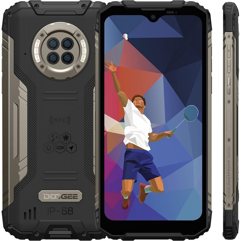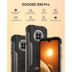 Teléfono rugerizado Doogee S96 Pro. Equipo octa-core con el chipset Helio G90 que cuenta con 8GB RAM y 128GB ROM. Gran batería de 6350 mAh y soporte para carga rápida de 24W. Equipado con NFC y 4 sistemas de navegación por satélite (GPS, Galileo, Glonass, Beidou). Cuatro cámaras de 48MP + 20MP + 8MP + 2MP. Cámara frontal de 16MP. Cuenta con cámara de Visión Nocturna de 20MP, está equipado con un 4 luces infrarrojas que permiten tomar fotos en una oscuridad absoluta. Pantalla de 6,22". Es extremamente resistente gracias al cristal de Corning Gorilla. Sus duras credenciales incluyen las certificaciones MIL-SPEC 810G, IP68 y IP69K. Robusto, impermeable y a prueba de golpes.