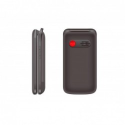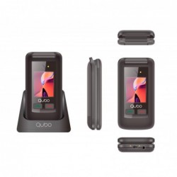 Móvil básico/senior Qubo Senior X-247 con pantalla de 2.4" + externa 1.77" VGA, 240 x 230 píxeles, 32MB RAM + 32MB internos, 2G, SIM + SIM, bluetooth, audio jack, radio FM y botón SOS, cámara trasera de 0.3MP, batería de 1.000mAh, conector USB-C y base de carga.