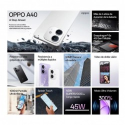 EQUIPO NUEVO, PRECINTADO, GARANTIA. El Oppo A40 cuenta con una pantalla HD+ de 6.67 pulgadas y tasa de refresco de 90Hz. Potenciado por un procesador Snapdragon 6s Gen 1 con 4GB de RAM y 128GB de almacenamiento, el Oppo A40 tiene una cámara dual con sensor principal de 50MP, batería de 5100 mAh de carga rápida, resistencia de grado militar y a salpicaduras, y corre Android 14.