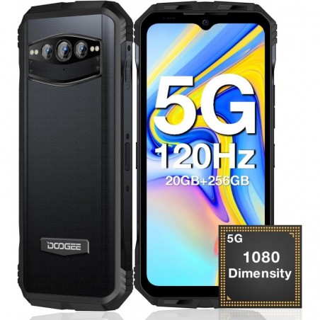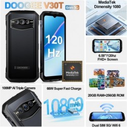 EQUIPO NUEVO, PRECINTADO, GARANTIA. Teléfono rugerizado Doogee V30T. Equipo Octa-core impulsado por el processador Dimensity 1080 5G con 12GB de RAM (expandible hasta 20GB) y 256GB de almacenamiento interno. Tiene una enorme batería de 10.800mAh con carga rápida de 66W y función OTG. Cuenta con cámara triple con AI con un sensor de 108MP, un sensor de 20MP de visión nocturna SONY y un sensor de 16MP, y una cámara frontal SONY de 32MP. Tiene una pantalla de 6.58" FHD+. Sus duras credenciales incluyen las certificaciones IP68/IP69K y MIL-STD-810G que lo hacen resistente a golpes, polvo y agua. Completa sus características con NFC y Android 12.