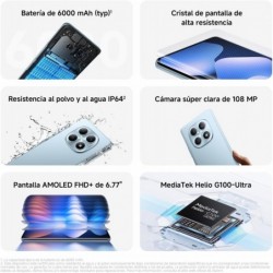 EQUIPO NUEVO, PRECINTADO, 3 AÑOS GARANTIA. El Xiaomi Redmi Note 15 tiene una pantalla AMOLED de 6.77 pulgadas con tasa de refresco de 120Hz y está potenciado por un procesador MediaTek Helio G100-Ultra con 6GB de RAM y 128GB de almacenamiento interno expandible. Su cámara dual es de 108MP + 2MP y su cámara frontal es de 20MP. Tiene lector de huellas integrado en la pantalla, parlantes stereo, y certificación IP64, y se alimenta de una batería de 6000 mAh de carga rápida.